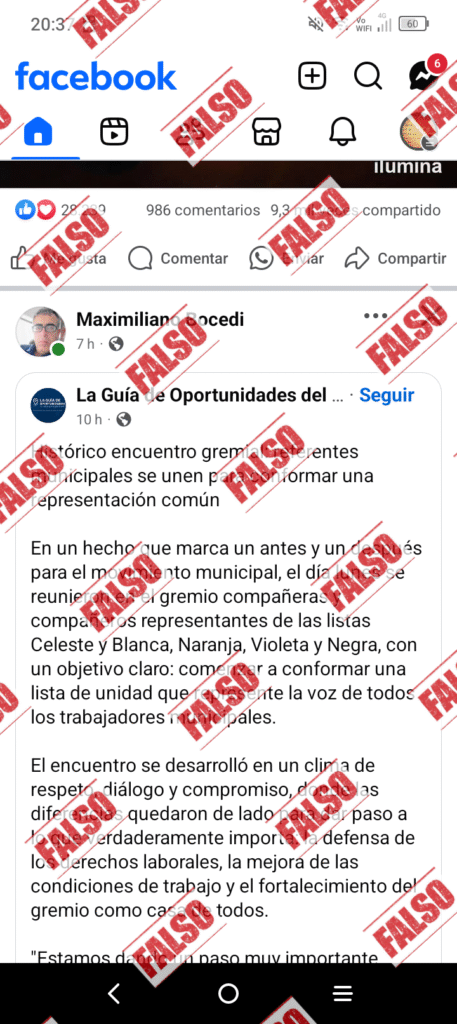 «A los afiliados del sindicato de municipales: Queremos desmentir la información que circula sobre una supuesta alianza entre el candidato de la Lista Violeta, Oscar Ríos, y el candidato de la Lista Azul.