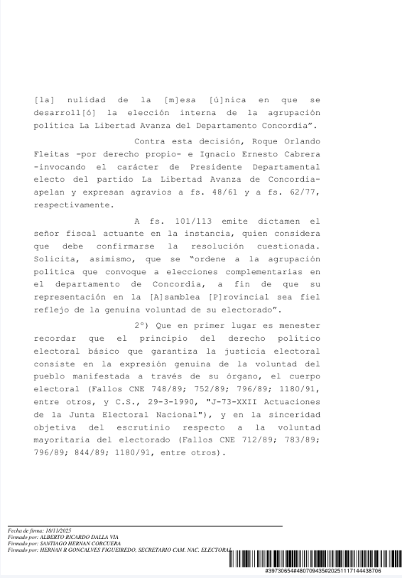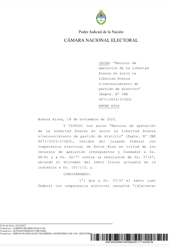 La Cámara Nacional Electoral confirmó la nulidad de la única mesa utilizada en la interna partidaria de La Libertad Avanza (LLA) en Concordia y dispuso que se convoquen comicios complementarios, tras detectar “graves irregularidades” en el escrutinio. La decisión profundiza la crisis interna del partido en Entre Ríos y vuelve a poner bajo la lupa la actuación de su presidente distrital, Roque Orlando Fleitas.