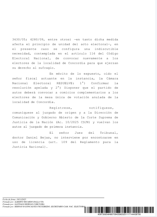 “Confirmar la resolución apelada y disponer que el partido convoque a comicios complementarios en Concordia.”