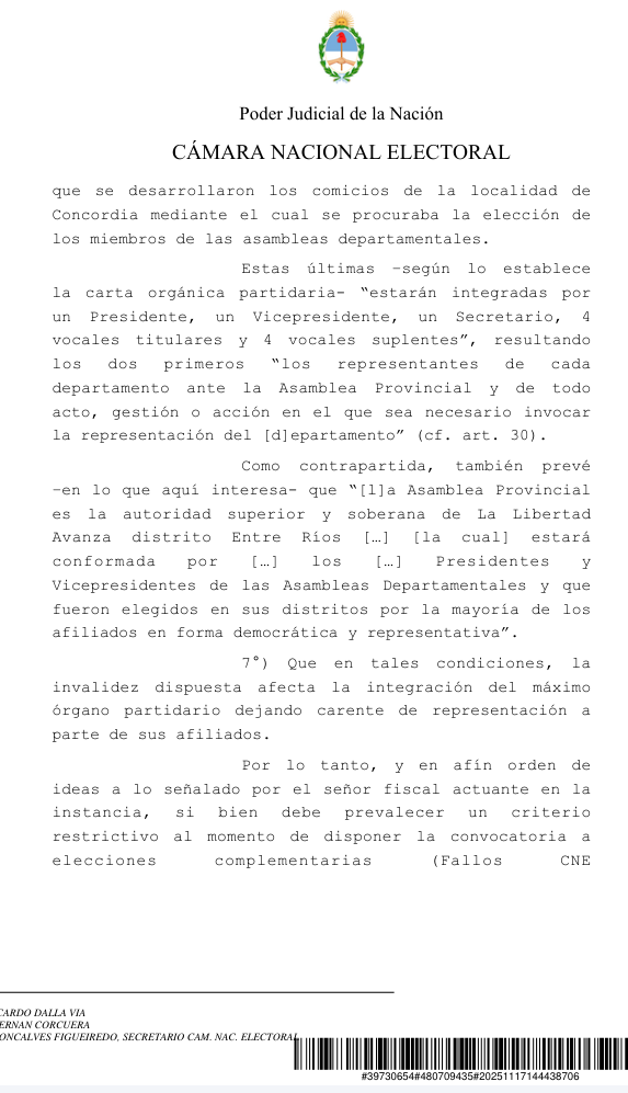La Cámara Nacional Electoral confirmó la nulidad de la única mesa utilizada en la interna partidaria de La Libertad Avanza (LLA) en Concordia y dispuso que se convoquen comicios complementarios, tras detectar “graves irregularidades” en el escrutinio. La decisión profundiza la crisis interna del partido en Entre Ríos y vuelve a poner bajo la lupa la actuación de su presidente distrital, Roque Orlando Fleitas.