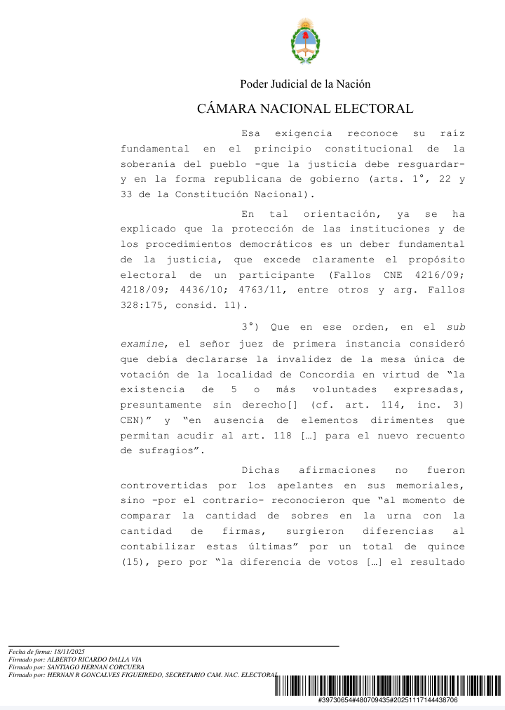 Según determinó el tribunal, la elección local presentó una diferencia de 15 votos entre sobres y firmas, cuando el máximo permitido por ley es 4. Esa discrepancia —considerada significativa— impidió validar el resultado como expresión fiel de la voluntad electoral.