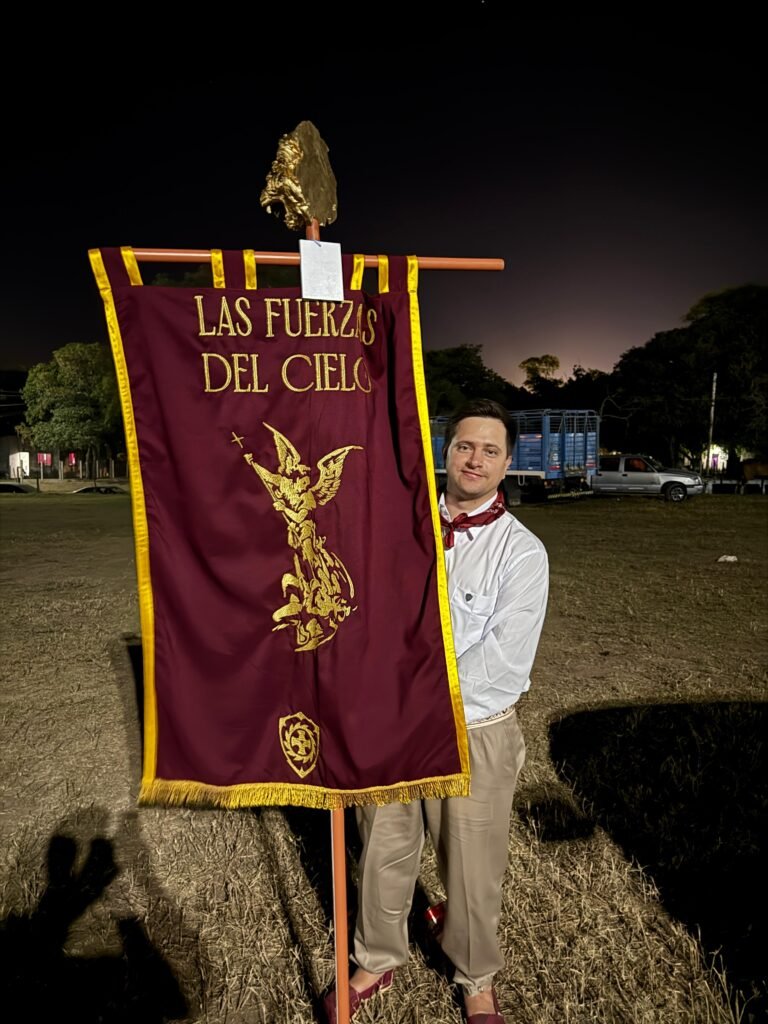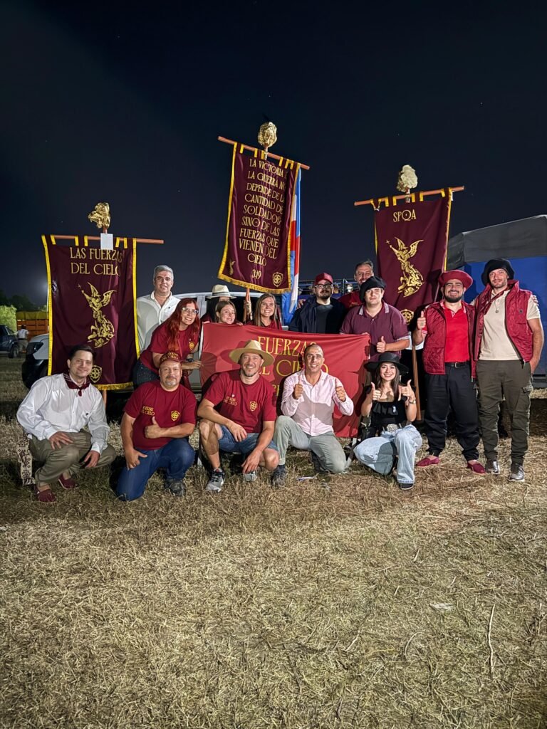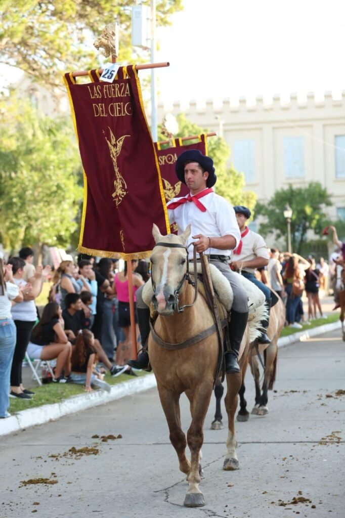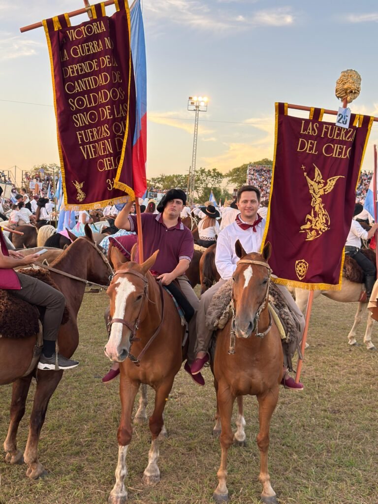 El desfile, organizado por la Agrupación Punta Gorda y que reunió alrededor de 600 equinos entre tropillas entabladas y jinetes, incluyó los clásicos estandartes que suelen portar figuras emblemáticas de la movida tradicionalista, “el Gordo Dan”, referente visible de Las Fuerzas del Cielo y uno de sus influencers más reconocidos envió sus estandartes y Las Fuerzas Del Cielo pudieron lucir los mismos.