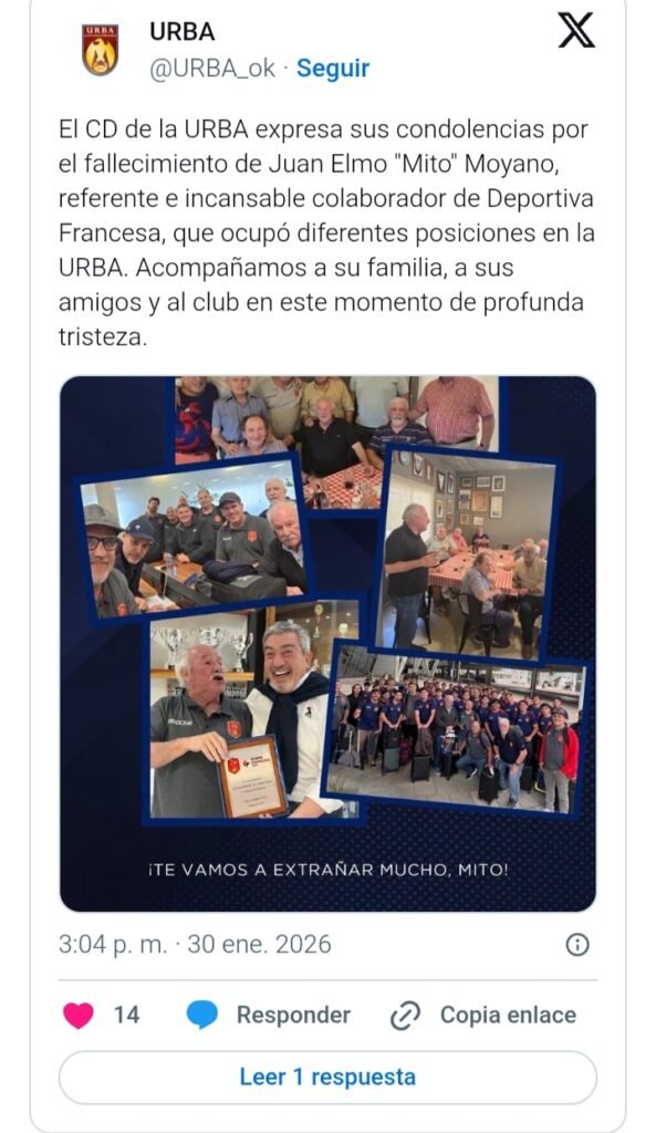 Desde la Unión de Rugby de Buenos Aires (URBA) expresaron sus condolencias: “El Consejo Directivo de la institución expresa sus condolencias por el fallecimiento de Juan Elmo “Mito” Moyano, referente e incansable colaborador de Deportiva Francesa, que ocupó diferentes posiciones en la URBA. Acompañamos a su familia, a sus amigos y al club en este momento de profunda tristeza».“La Agrupación Veteran Rugbiers despide con profundo pesar al entrañable Mito, gran dirigente y entusiasta colaborador de esta institución, acompañando a su familia en este triste momento”, fue uno de los tantos sentidos mensajes que se publicaron en los avisos fúnebres de este diario para recordar al histórico Puma.“Nuestro querido doctor”Desde el club Asociación Deportiva Francesa escribieron en sus redes otro sentido mensaje: “Hoy nos toca despedir a nuestro querido Dr. Juan Elmo Moyano, para todos Mito, por un muy lamentable accidente de tránsito que sufrió en Punta del Este. Mito es una verdadera leyenda de Depo. Llegó al club luego de jugar en SITAS y Los Matreros y fue integrante del plantel superior”.