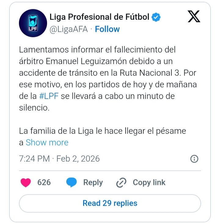 Leguizamón regresaba junto a sus compañeros de terna luego de dirigir el encuentro entre Boxing Club de Río Gallegos y La Amistad de Cipolletti. El vehículo, una camioneta conducida por el árbitro principal Cristian Rubiano, perdió el control por causas que aún se investigan y terminó volcando.Como consecuencia del siniestro, Leguizamón —quien se desempeñaba como cuarto árbitro— perdió la vida en el acto. Rubiano sufrió fractura de pierna y múltiples traumatismos, mientras que los asistentes Diego Pereyra y Yasu Muñoz presentaron heridas cortantes y politraumatismos. Todos fueron trasladados al Hospital Zonal de Caleta Olivia, donde permanecen internados.La tragedia generó una fuerte conmoción en el ambiente deportivo. La Liga Profesional de Fútbol (LPF) expresó su pesar a través de un comunicado oficial y anunció que se realizará un minuto de silencio en todos los partidos programados para este lunes y martes.