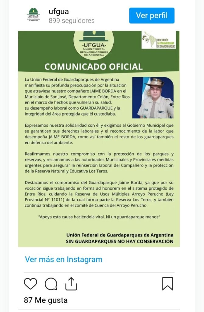 Tras conocerse el despido, la Unión Federal de Guardaparques de Argentina manifestó su “profunda preocupación” por la situación y lanzó una campaña de firmas en la plataforma Change.org para exigir su reincorporación inmediata.“Ningún guardaparque menos. ¡Reincorporación ya del guardaparque Jaime Borda!”, señala el encabezado de la petición.