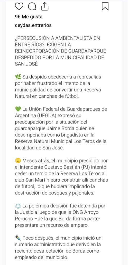 El caso también generó el respaldo del Centro para el Estudio y Defensa de las Aves Silvestres (CEYDAS), que puso en duda las razones del despido y habló de una posible “persecución ambientalista” en Entre Ríos.