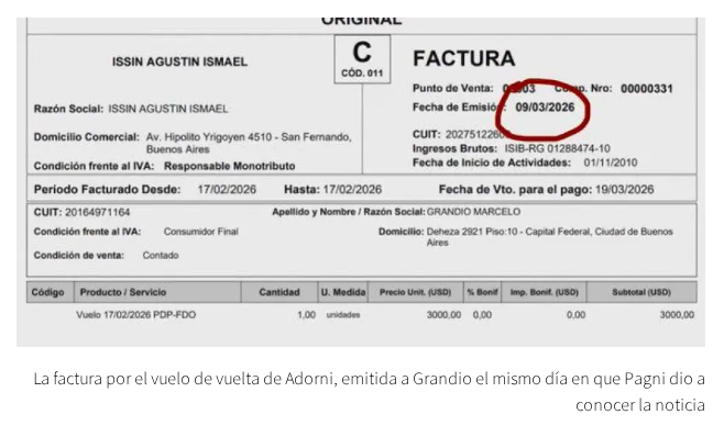 El comprobante, que dio a conocer el canal de noticias A24, fue emitido por el broker aeronáutico Agustín Ismel Issin con fecha del 9 de marzo, coincidiendo con el momento en que el caso comenzó a tener repercusión pública. Allí figura el trayecto realizado el 17 de febrero entre Punta del Este y San Fernando, identificado como “PDP-FDO”, y aparece nuevamente el nombre de Grandio como responsable de la operación.