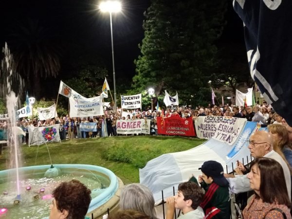 Alrededor de la fuente se podían observar a dirigentes como el ex gobernador Gustavo Bordet y su esposa, la diputada Mariel Ávila, el ex intendente Enrique Cresto, el diputado provincial Marcelo López (JxER), algunos de los concejales actuales del Justicialismo, como Pablo Bovino y Carolina Amiano, algunos ex concejales como Mariano Giampaolo o Luis Edgardo Jakimchuk, etc. Además se podían leer los carteles con las banderas de partidos políticos, como el Partido Justicialista de Concordia, el Partido Comunista, el Partido Nuevo Encuentro, movimientos sociales como la UTEP (Unión de Trabajadores de la Economía Popular), gremios como AGMER, la CTA (Central de Trabajadores Argentinos) Concordia, la Asamblea de Mujeres Lesbianas, Travestis y Trans, entre otros.