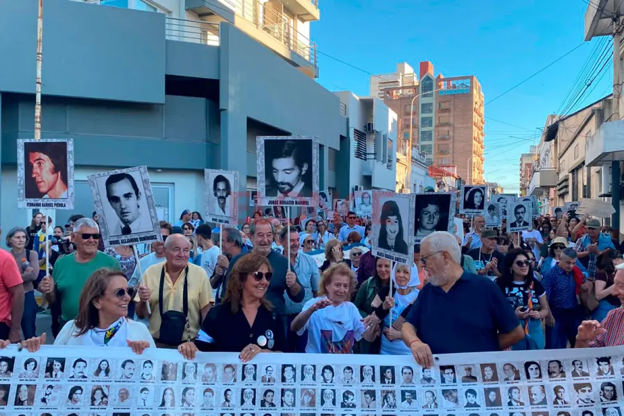 Durante la movilización, los participantes expresaron consignas vinculadas a la memoria colectiva, la defensa de los derechos humanos y el rechazo al negacionismo.