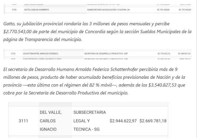 Un ejemplo: el Dr. Ignacio Del Valle, abogado en actividad, se desempeña actualmente como Subsecretario de Legal y Técnica en la Municipalidad de Concordia. Percibe como sueldo casi lo mismo que Gatto y bastante menos que Schattenhofer