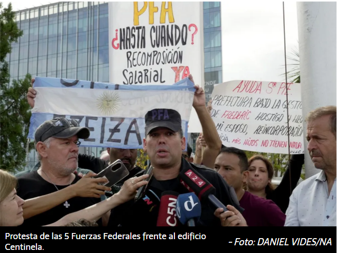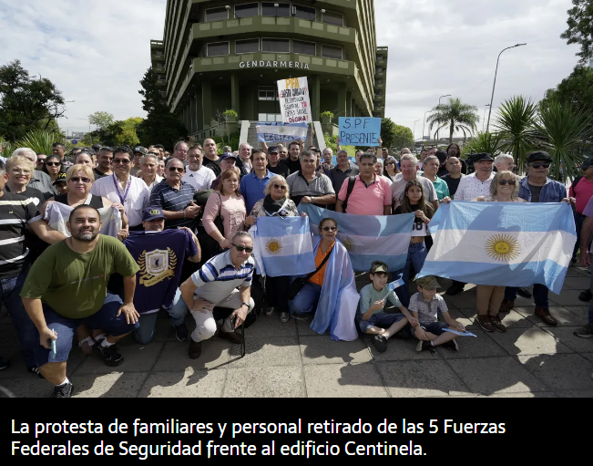 Las 5 Fuerzas Federales de Seguridad se unieron para reclamarle a Javier Milei mejores salarios. La protesta, encabezada mayormente por familiares y efectivos retirados, fue frente al edificio Centinela.